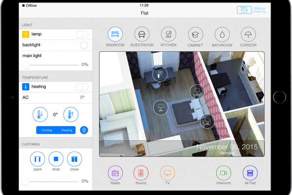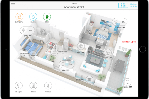 Вместо большого количества обычных выключателей и регуляторов, в умном интерьере используется одна панель управления, осуществляющая целый комплекс функций (включение/выключение света, регулирование яркости освещения, управление температурой, открытие/закрытие штор и т.п.). При этом устройства очень просты и интуитивно понятны в управлении.